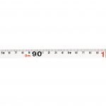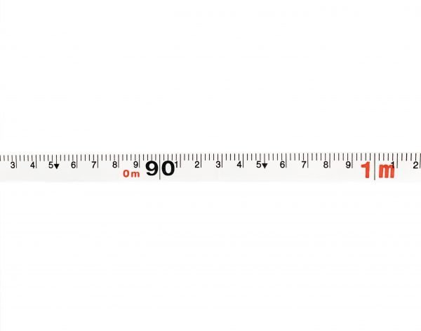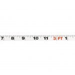 The tape features both inch and metric increments (inches on top, metric on the bottom). Inch measurements repeat 1-12 and feet are shown in red. Centimeters repeat 1-100, and meter marks are shown in red. Made of durable, non-stretch, nylon reinforced vinyl-coated fiberglass with a rugged ABS plastic case and rubber grips.