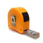 Bright orange ABS plastic Case with locking mechanism. Right-to-left read 25ft / 7.5m split-scale imperial (1/16ths) and metric tape with high contrast black on white print. Reads right-to-left to accommodate left-handed use by lefties or tradesmen preferring to make marks with their right hand. Length: 25ft/7.5m; Width: 1″