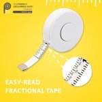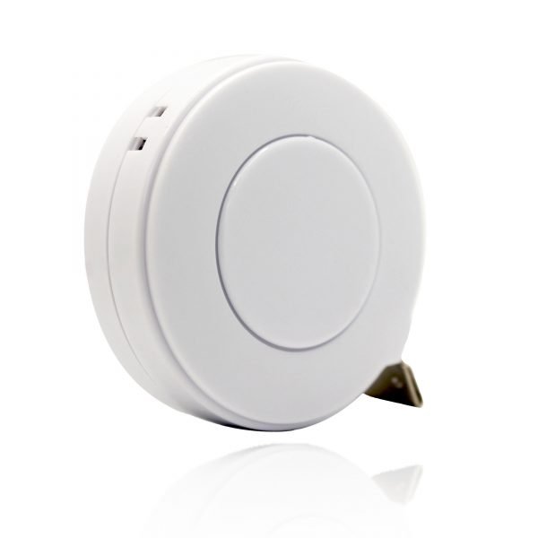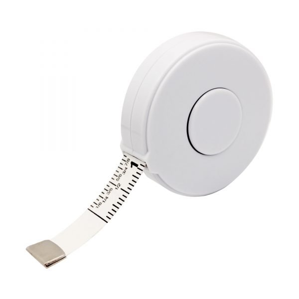 Retractable 80″/2m multi-purpose soft measuring tape with white ABS plastic case and white button. Length: 80″/2m; Width: 13mm