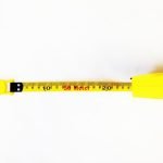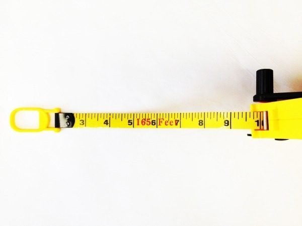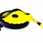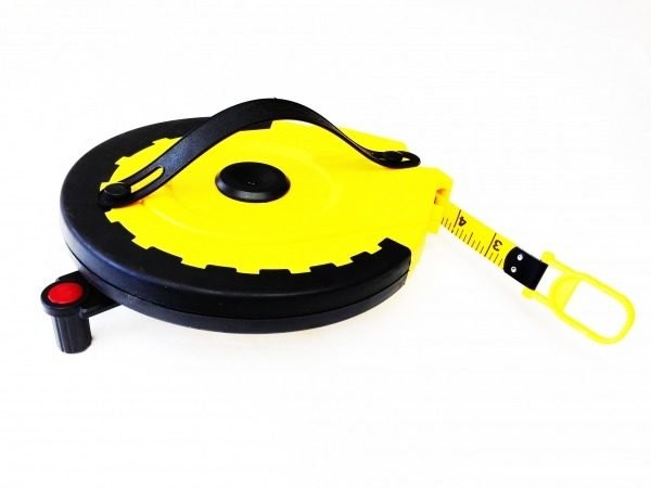 Yellow ABS plastic with rubber grip inlay and folding hand-reel. Vinyl coated fiberglass tape with nylon reinforcement showing inches down to eighths and metric down to mm. Closed reel design with a lockable looped endpiece and collapsible carrying strap. Length: 165ft/50m; Width: 15mm