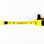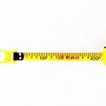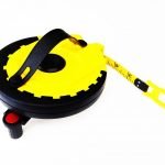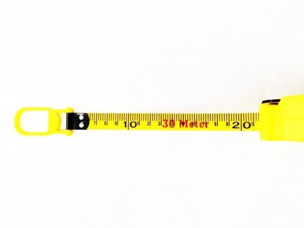 Yellow ABS plastic with rubber grip inlay and folding hand-reel. Vinyl coated fiberglass tape with nylon reinforcement showing inches down to eighths and metric down to mm. Closed reel design with a lockable looped endpiece and collapsible carrying strap. Length: 100ft/30m; Width: 15mm