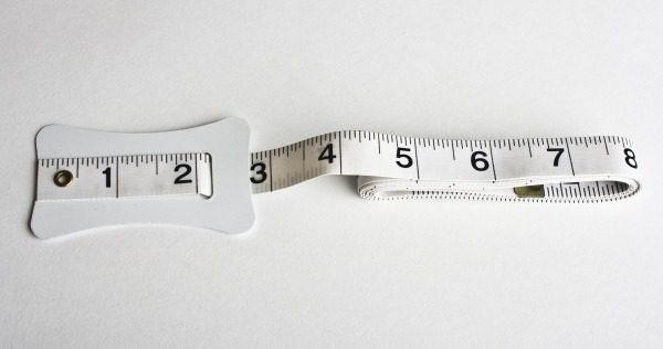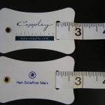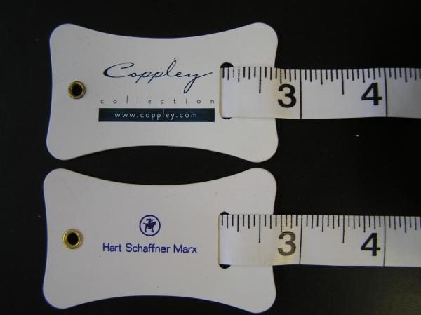 White vinyl-coated fiberglass tailoring tape with inches (down to 1/16ths) on both sides and a crotch piece for discretely taking inseam measurements. Length: 72″; Width: 16mm
