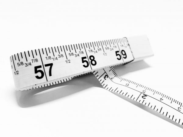 White vinyl-coated fiberglass tailoring tape with inches (down to 1/16ths) and easy-read printed inch fractions down to eighths of inches on one side, and split-scale inches and metric on the other side. Length: 60″/1.5m; Width: 16mm